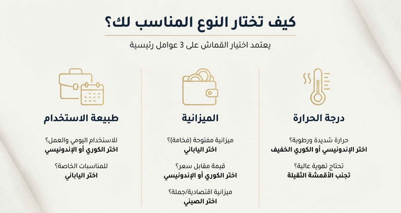 المناطق شديدة الحرارة تحتاج قماش خفيف جدًا بتهوية عالية مثل الإندونيسي أو الكوري الخفيف.