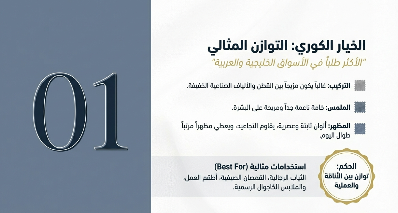 القماش الكوري غالبًا يكون مزيجًا بين القطن وألياف صناعية خفيفة، مما يجعله عمليًا للملابس اليومية والدوام.