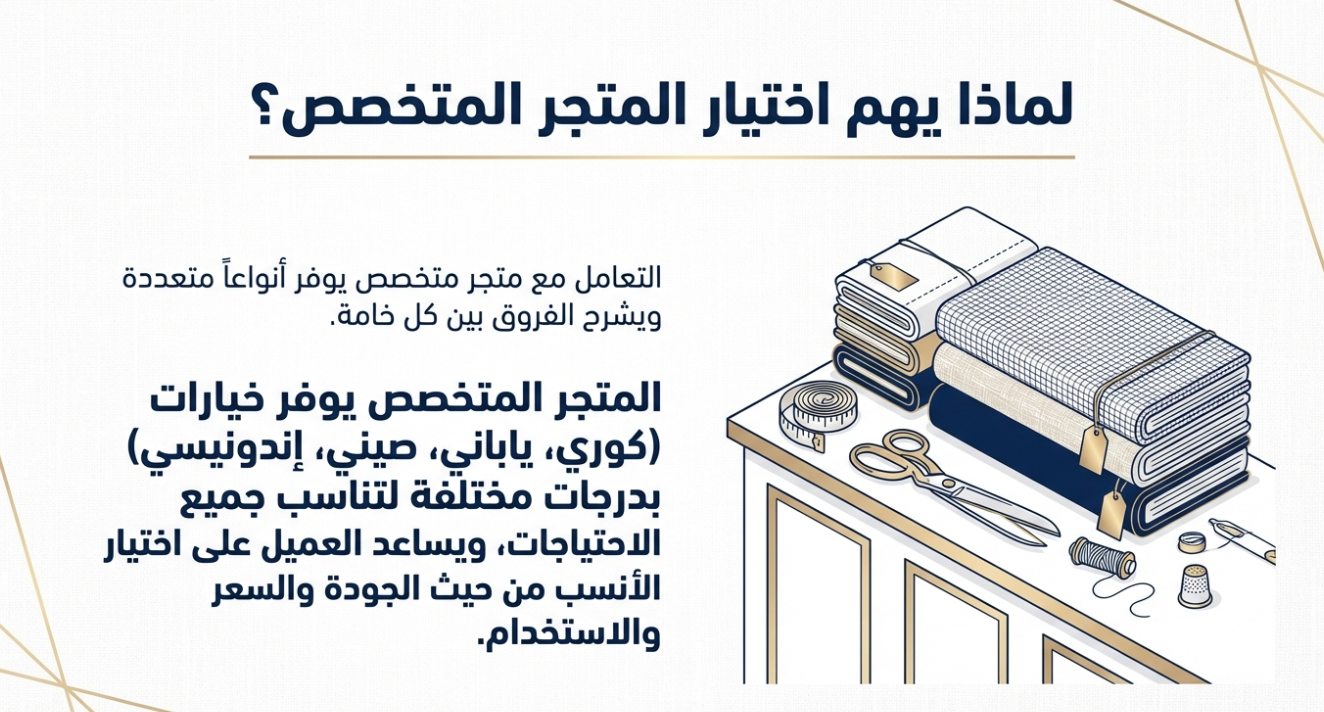 عند شراء الأقمشة، يفضل التعامل مع متجر متخصص يوفر أنواع متعددة ويشرح الفروق بين كل خامة. التنوع يساعد العميل على اختيار الأنسب له من حيث الجودة والسعر والاستخدام.