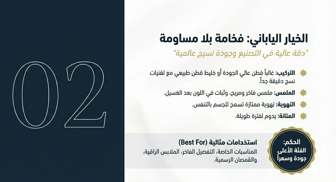 الأقمشة الياباني غالبًا تكون قطن عالي الجودة أو خليط قطن طبيعي مع تقنيات نسج دقيقة جدًا، ما يجعلها مثالية للرجال الباحثين عن الفخامة.