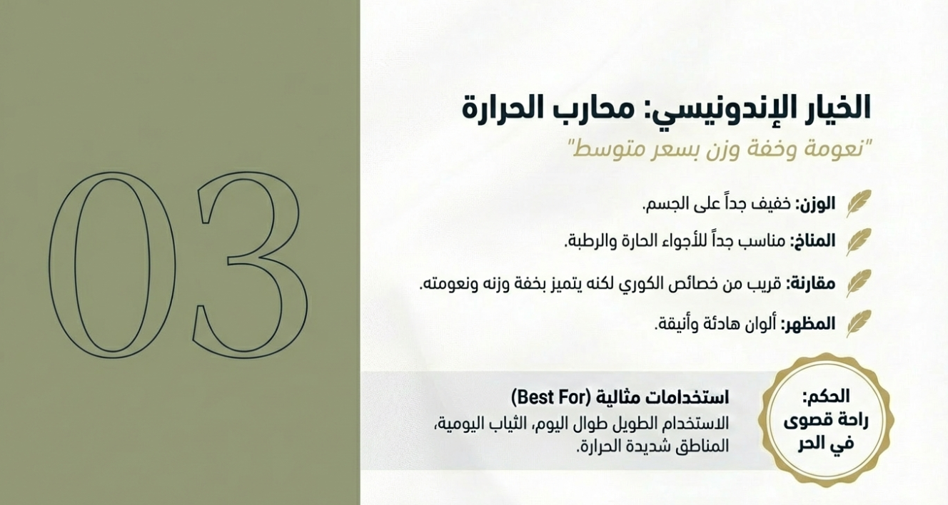 • إذا أردت خفة قصوى وراحة في الحر ➜ الإندونيسي اختيار ذكي.