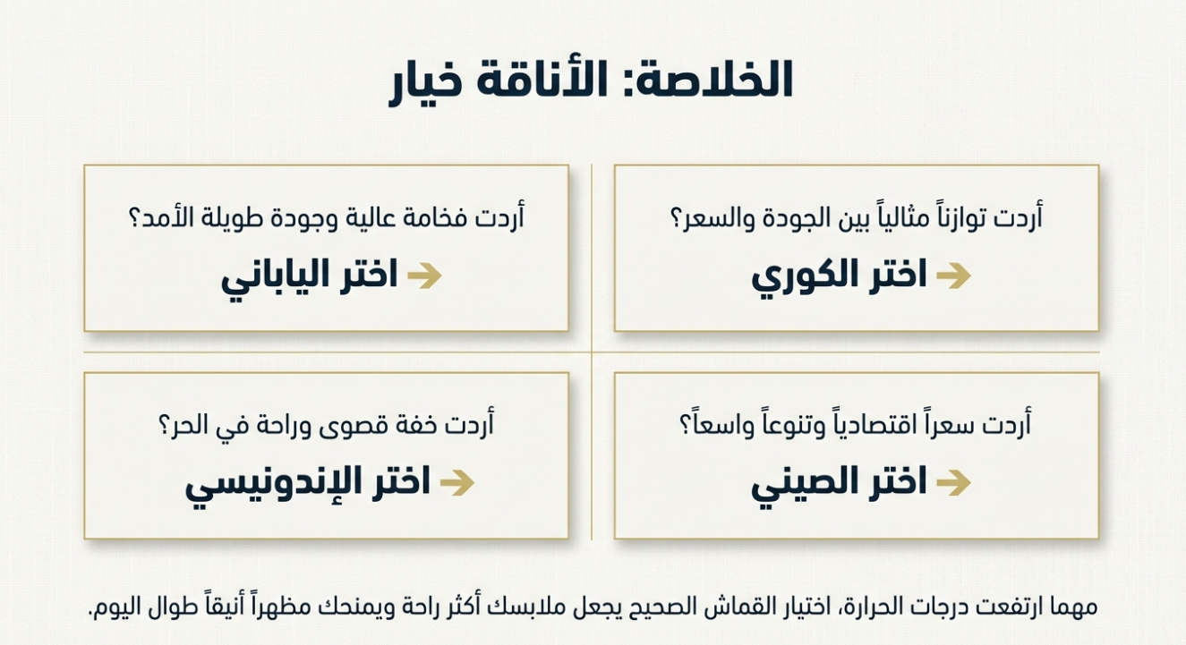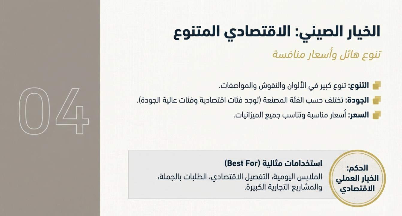 • إذا أردت سعر اقتصادي وتنوع واسع ➜ الصيني مناسب.